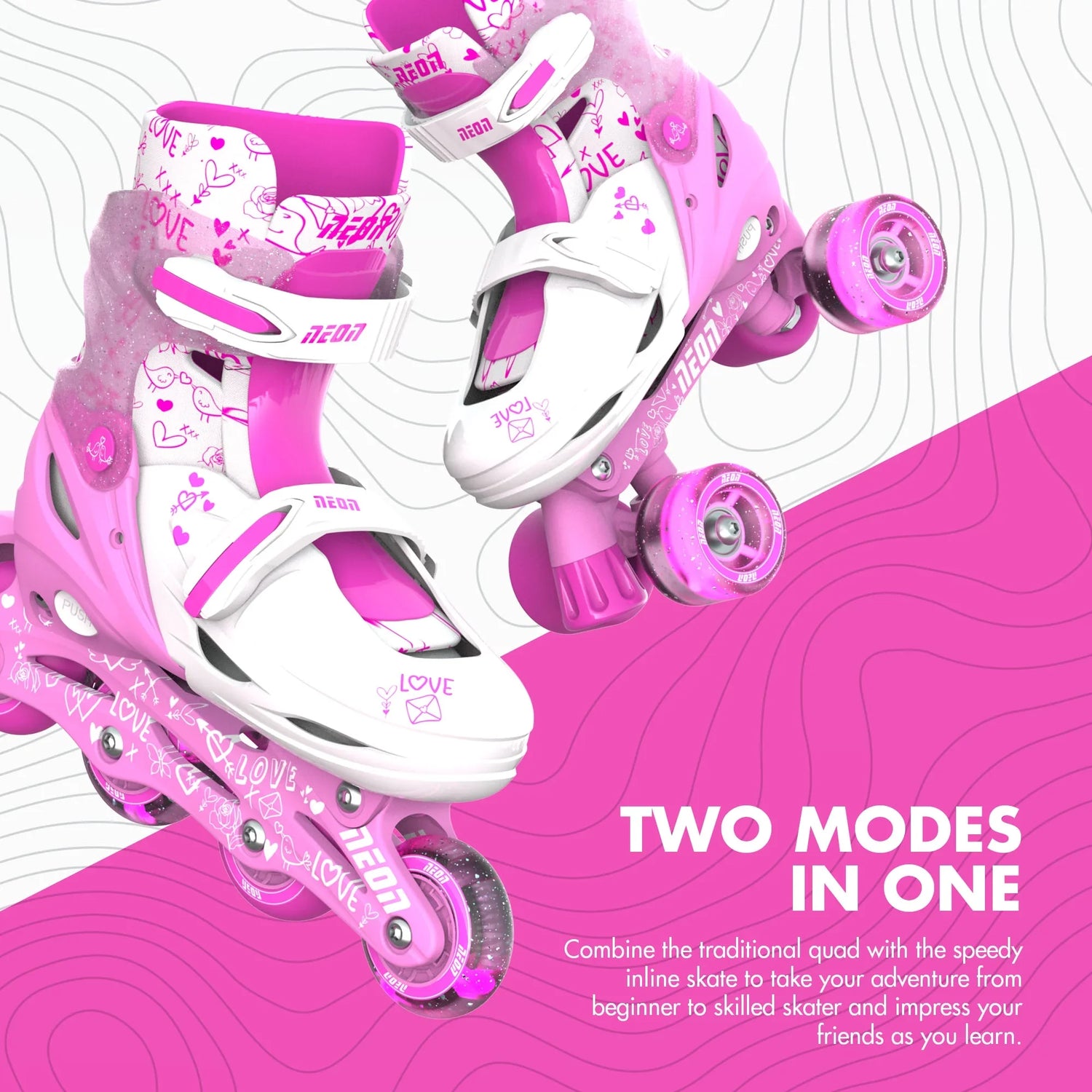 The Neon Combo Skates in Pink bring bright colours, comfort, and a clever two in one design that helps kids learn with confidence. They can start on the stable quad setup and switch to inline mode when ready, while the adjustable boot grows across sizes UK 2 to 5 for a secure and comfortable fit. The light up PU wheels add extra excitement and better visibility, and the supportive buckles and padded liner keep each ride steady, fun, and comfortable from the first push to faster glides.