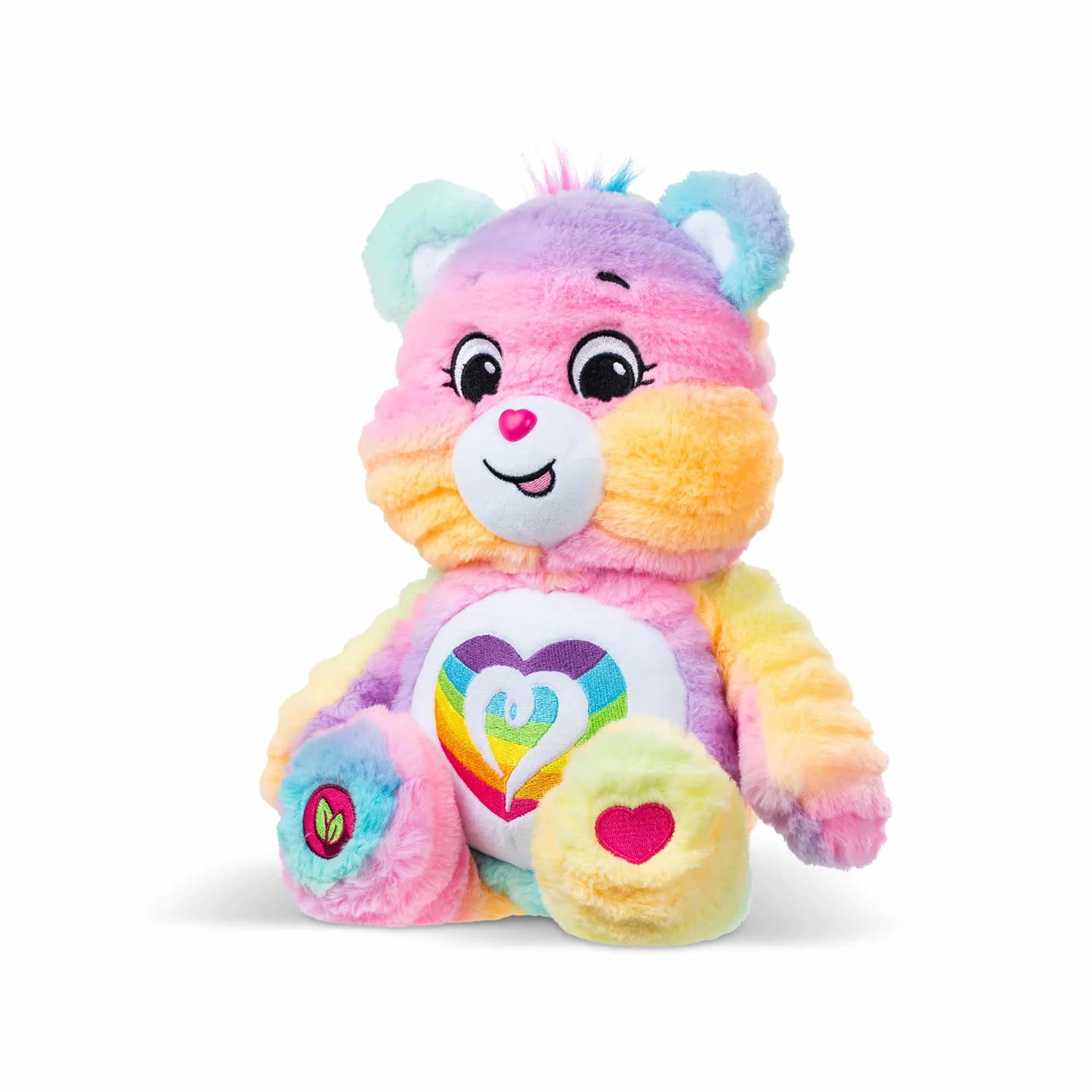The 35 cm (14 inch) Care Bears Color Splash Togetherness Bear is a plush symbol of kindness and unity. With soft rainbow tie-dye fur and a beautifully embroidered rainbow heart belly badge, she brings colour and warmth to every hug. Made with sustainable materials, she shows that caring for friends and the planet go hand in hand.