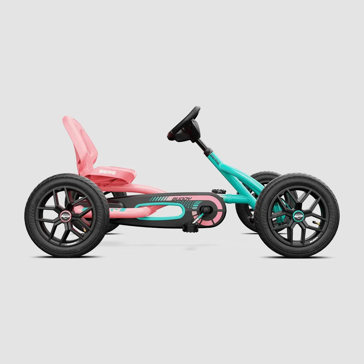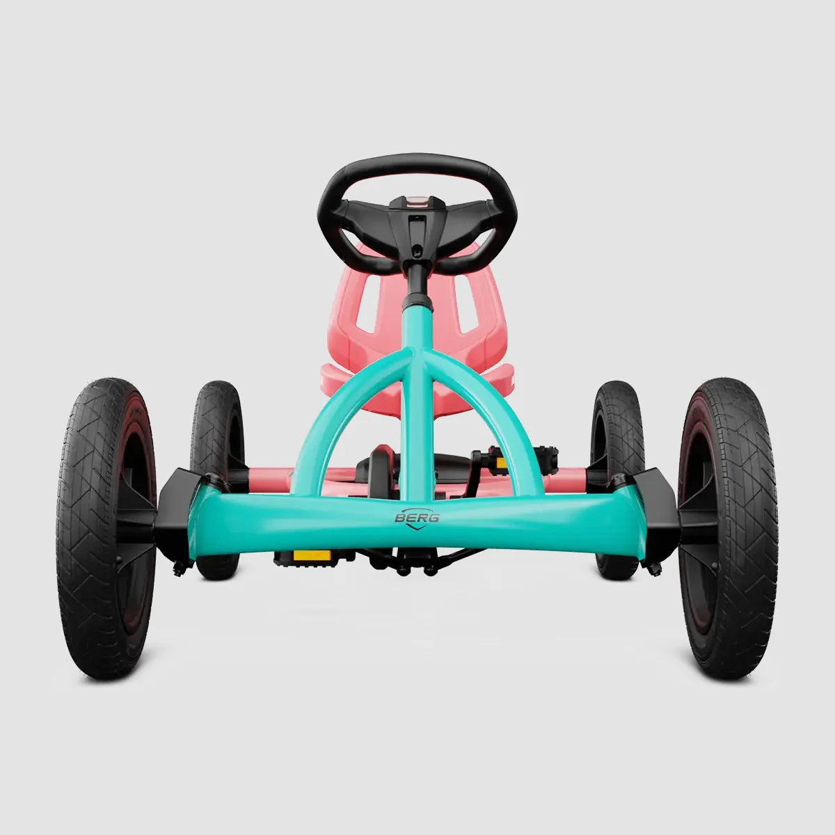 The BERG Buddy Lua go-kart is designed to bring outdoor adventure to life with its vibrant styling and kid-friendly design. Built for children aged 3 and up, this ride-on features a stable four-wheel structure and BERG’s patented BFR system, letting young drivers pedal forward, brake, and reverse with a single intuitive motion. The seat is height-adjustable across three positions to accommodate growing riders, while pneumatic tyres ensure a smooth, low-resistance ride on pavements or paths. With a swing axle that helps absorb uneven terrain and responsive steering, the Buddy Lua is more than just a go-kart — it’s a bold statement for every young explorer. Whether cruising the driveway or leading the pack on the playground, this is one kart that’s made to impress.
