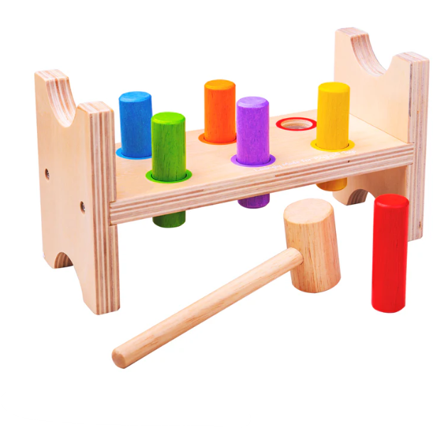 Developing hand/eye co-ordination has never been more fun than with the Bigjigs Toys Hammer Bench! Tap the brightly coloured wooden pegs down through the holes to create a flat workbench. Then, turn the whole thing over and start again! This wooden Hammer Bench is supplied with a sturdy hammer and features gently curved edges. Helps to develop dexterity and co-ordination. Made from high quality, sustainably sourced FSC® Certified wood. Conforms to current European safety standards. Consists of 8 play pieces.