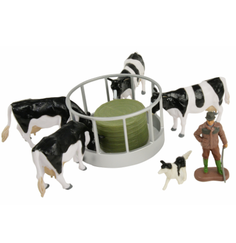 - Includes round feeder, green bale, 4 Friesian cattle, farmer, and dog