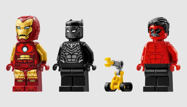 - LEGO® Marvel characters – The buildable toy includes Iron Man, Red Hulk and Black Panther minifigures, plus a Dum-E LEGO figure, Iron Man’s robot assistant, carrying its trusty fire extinguisher