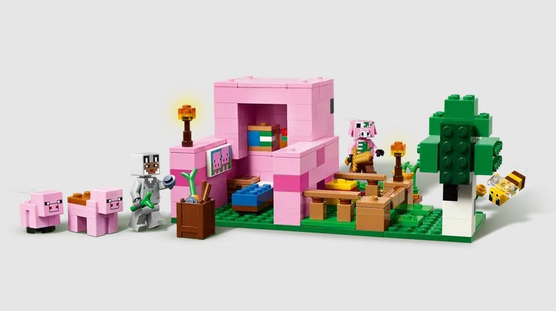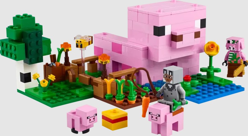 - LEGO® Minecraft® baby pig house – Kids build a pig-shaped house that comes with a farm plot where potatoes and beets grow, a field with a gate to guide the baby pig through and more