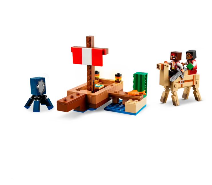 This LEGO Minecraft pirate adventure set includes a buildable vehicle toy, plus a squid, camel, 2 pirate figures and accessories. Featuring pirates and a boat, and the first-ever appearance of an adult LEGO Minecraft camel, this special LEGO set will appeal to Minecraft fans. The camel’s 2-seat saddle has room for both pirates to ride to their next adventure. Accessories, including a fish, map, iron sword and a cactus help inspire imaginative play. The set combines easily with other LEGO Minecraft sets (sold separately) for even more play possibilities.