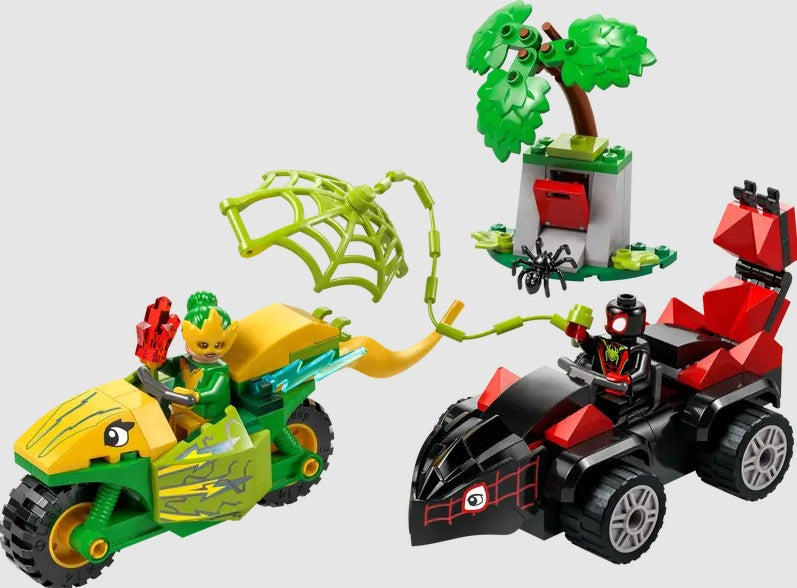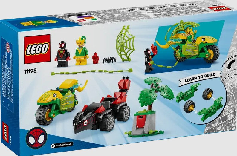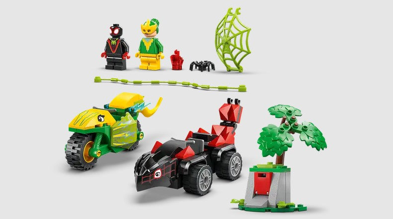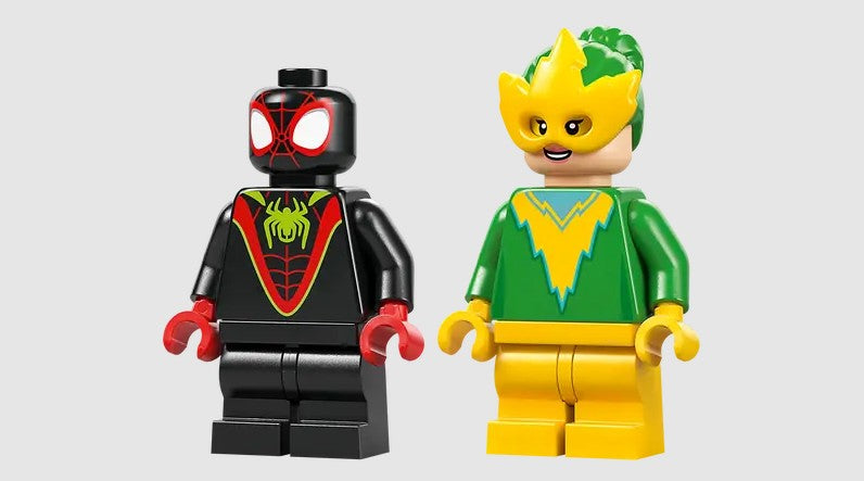 The set recreates action from the ’Dino-Webs’ season of the Spidey And His Amazing Friends TV show. It includes 2 Super Hero minifigures and 2 push-along dino-vehicles: Miles "Spin" Morales in a stegosaurus car and Electro in a dilophosaurus motorcycle. A large web element, a crystal hidden inside a rock, plus landscaping accessories inspire kids’ creative role play. Inside the box, each bag contains bricks and a large Starter Brick for a quick-to-build model and character, so play gets started quickly. Intuitive instructions are provided in the form of a colorful picture-story guide.