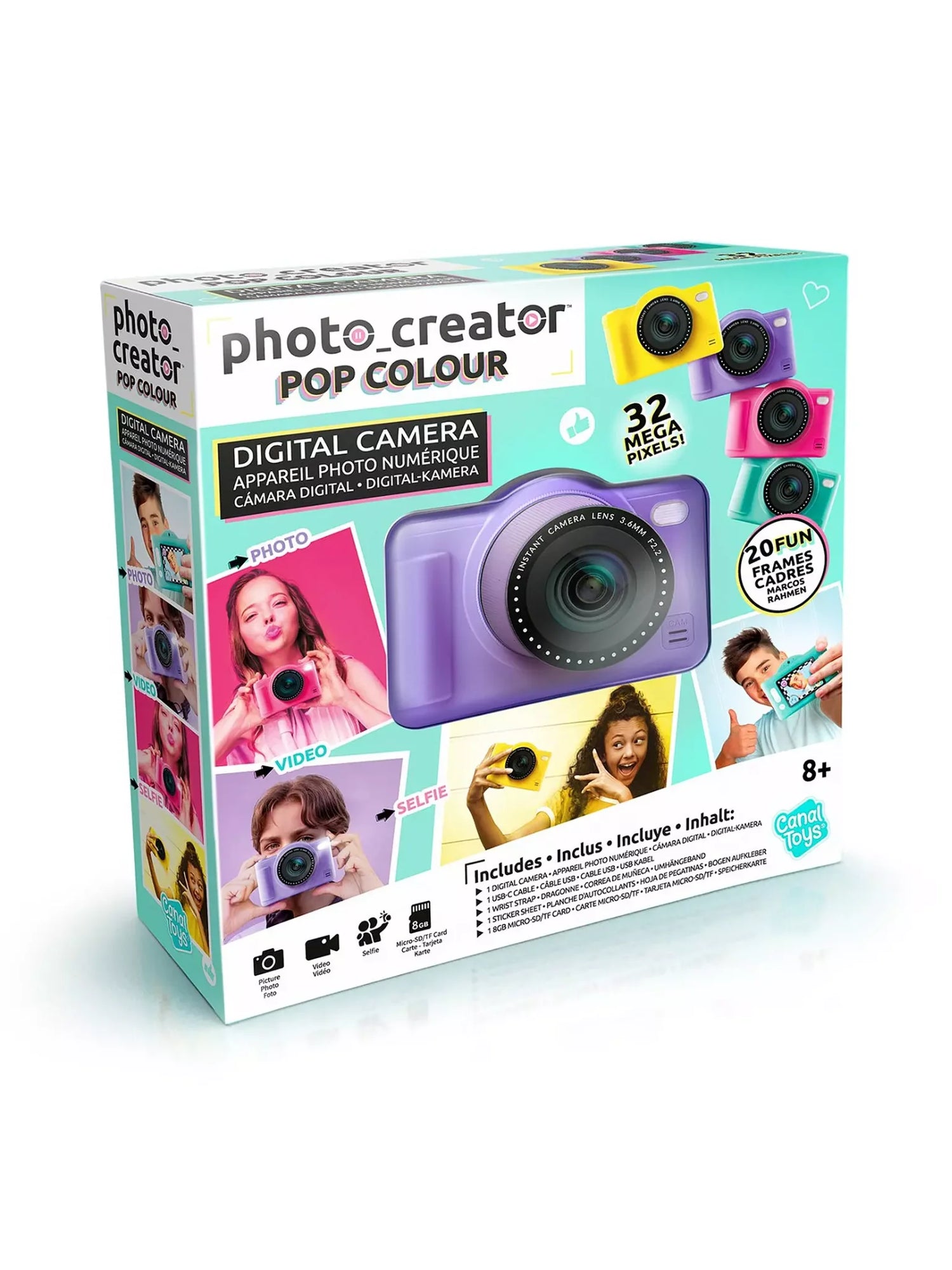 The Photo Creator Pop Colour camera gives children a fun way to capture their own photos and videos. Compact and easy to carry, it is available in two bright colour options, purple and green, so kids can pick the style that suits them best. With simple controls, a selfie lens, fun frames, and colourful stickers for personalising the camera, it encourages children to record everyday moments with friends and family. The included memory card and charging cable mean it is ready to use straight out of the box, making it a great choice for creative play at home or on the move.